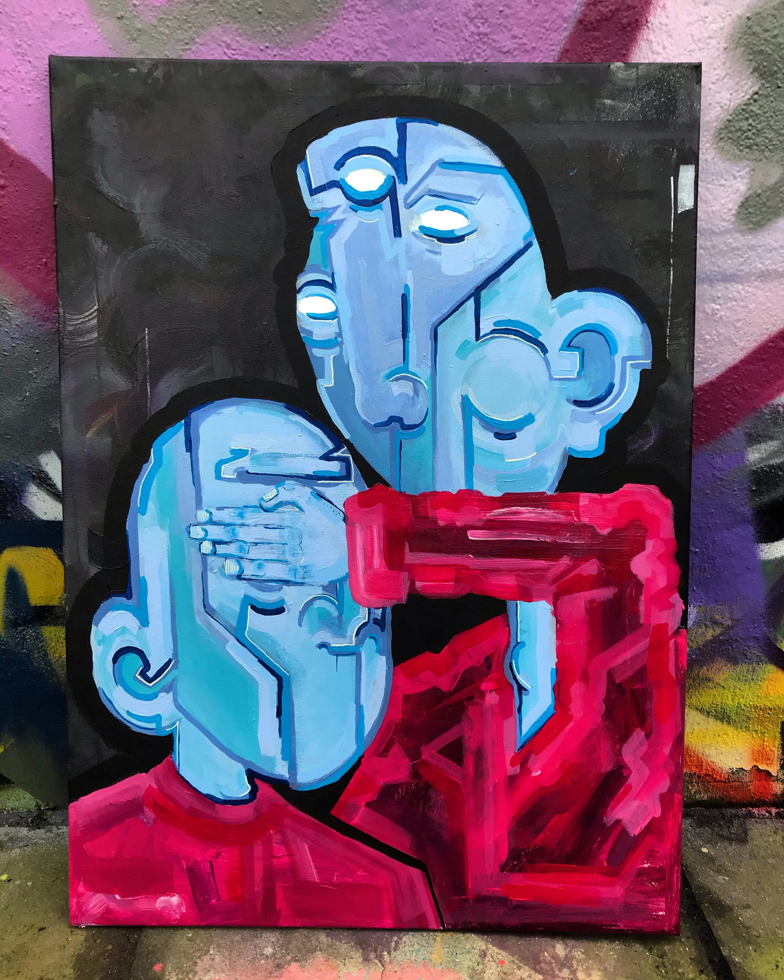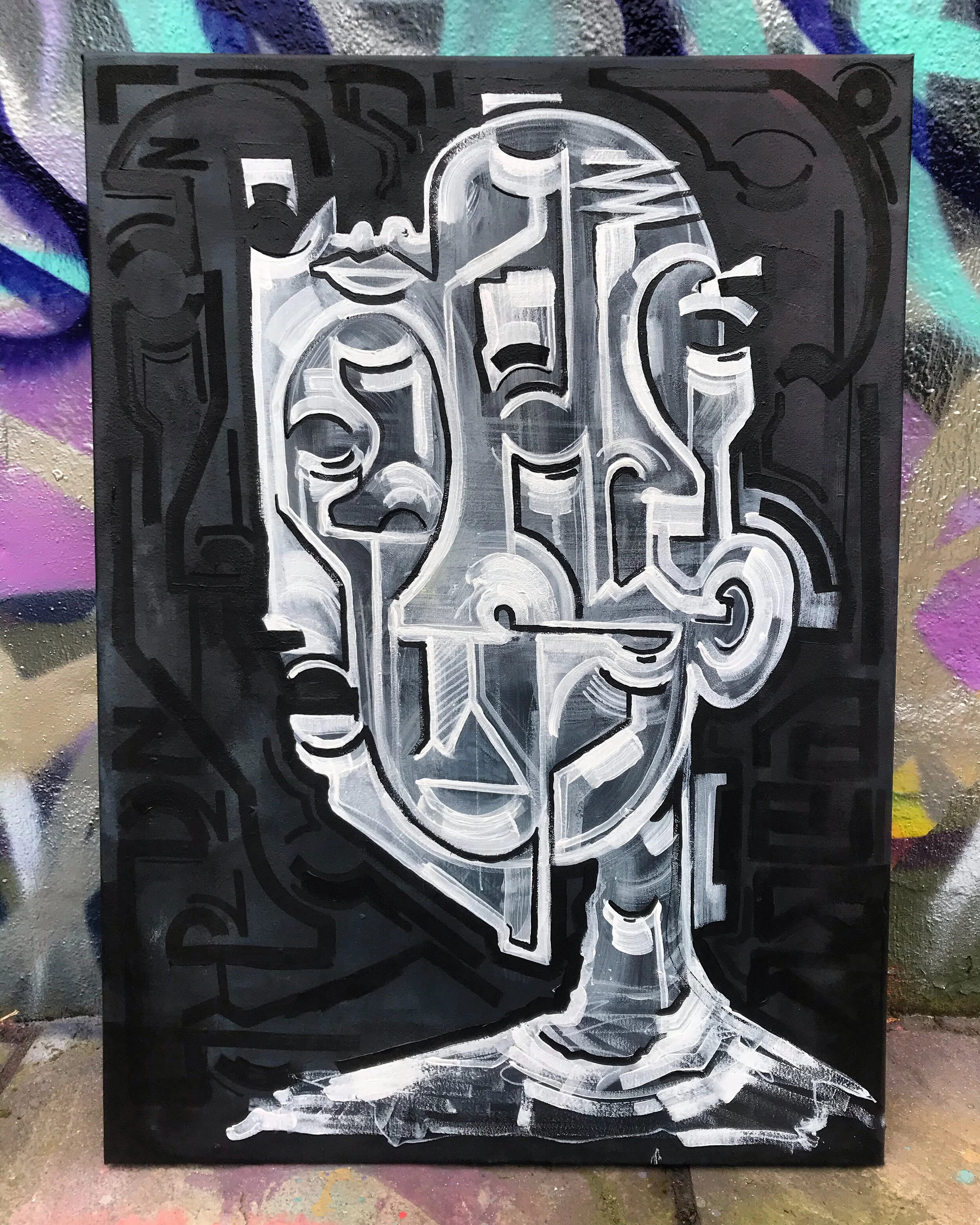 Starting off with an initial interest in graffiti, over time Hidden Faces has become focussed on a unique style of artistic expression. He’s now consistently creating outstanding figurative pieces loaded with layers of personality. He explores a range of mediums in his work, with a foundation in digital illustration, but now expanding into different types of paint.