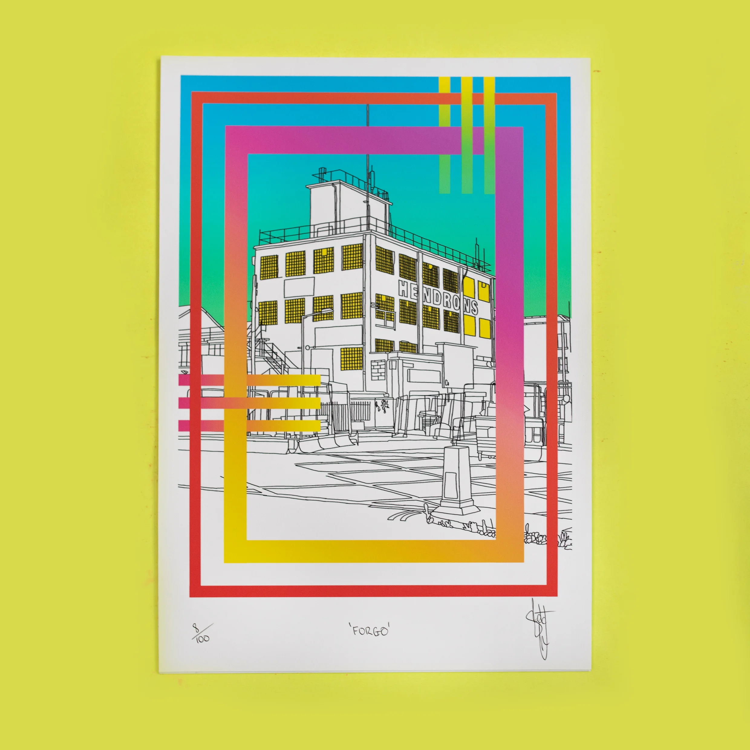 Sketchy Inc or Shane O'Connor is a Galway born screen print artist currently living and working in Dublin. 'O’Connor moved to Dublin from Galway five years ago and since graduating from NCAD with a Masters in print, his adopted city has become something of an immense and fruitful muse to him. Simple walks around town are enough to inspire a new print, which is a testimony to the abundance of intriguing architectural quirks that are scattered throughout Dublin. His hyper-detailed prints, daubed with psychedelic colours, highlight each of these quirks that give Dublin its pleasantly warped character.'